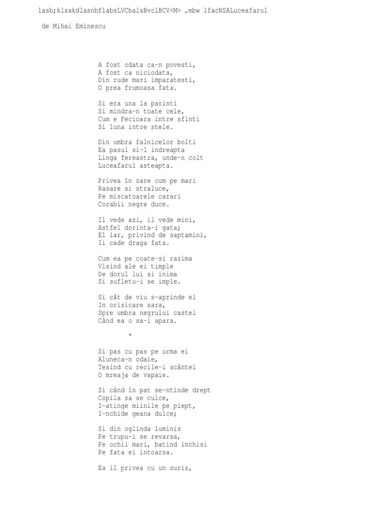 Ea traia pe o insula numita bitch. Din umbra falnicelor bolti ea pasul si l indreapta linga fereastra unde n colt luceafarul asteapta. Privea în zare cum pe mari rasare si straluce. De atata dor.