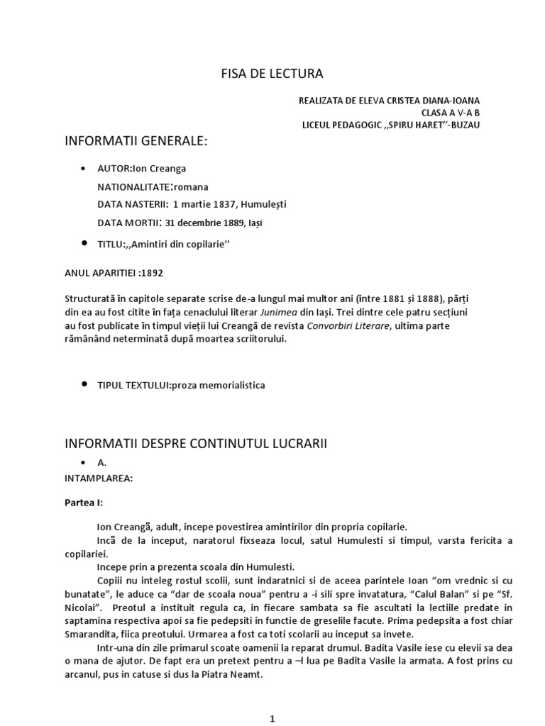 Fisa De Lectură Amintiri Din Copilărie