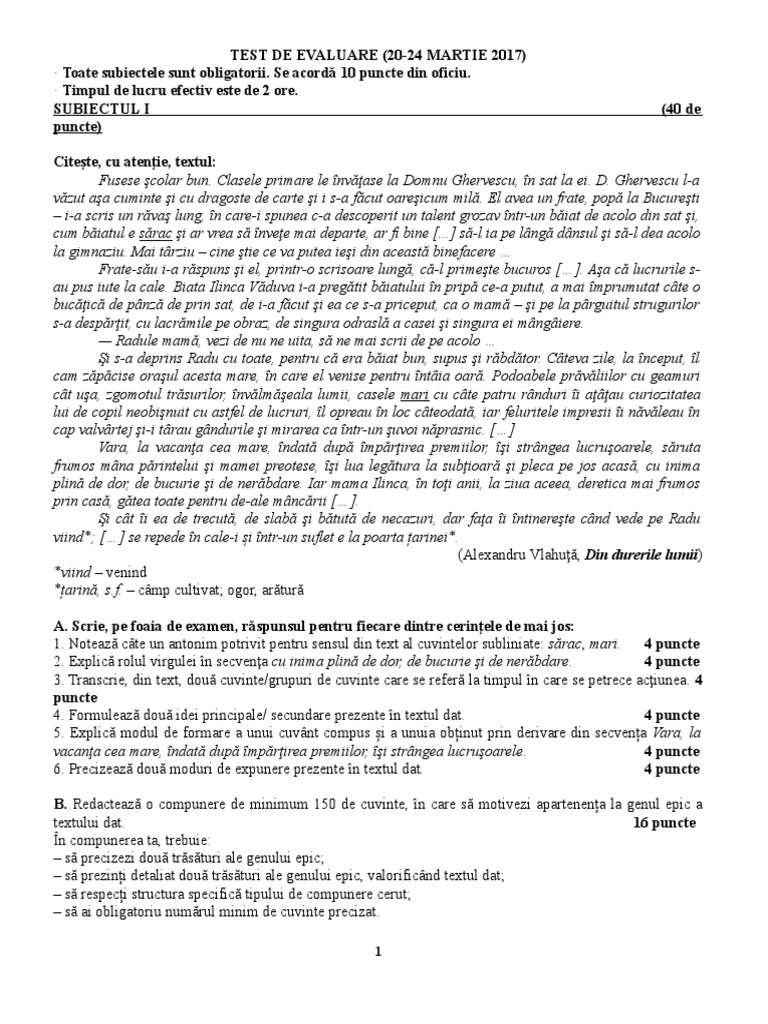 Evaluare Națională 2020 Subiecte La Limba și Literatura Romană Compunere Despre Apartenența La Genul Epic A Unui Text și Redactarea Unui Text Narativ