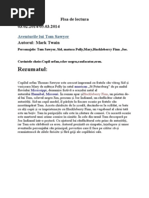 Fisa De Lectura Aventurile Lui Tom Sawyer