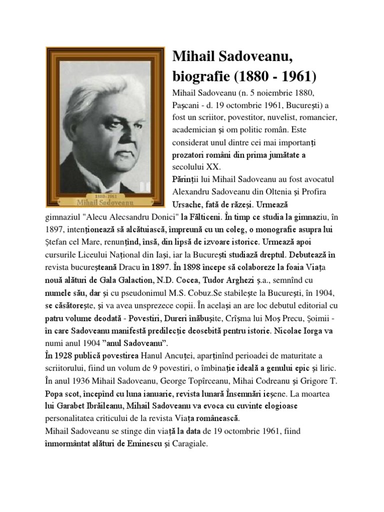 One of the most prolific romanian language writers he is remembered mostly for his historical and adventure novels as well as for his nature writing. Părinții nefiind căsătoriți paternitatea scriitorului și a fratelui său dimitrie mort de scarlatină în 1888 au fost recunoscute abia. Biografie mihail sadoveanu 1880 la 5 noiembrie la pașcani se naște mihail sadoveanu scriitor povestitor nuvelist romancier academician și om politic român. 1880 1892 sadoveanu isi petrece anii copilariei la pascani si vara la bunicii din partea mamei la verseni.