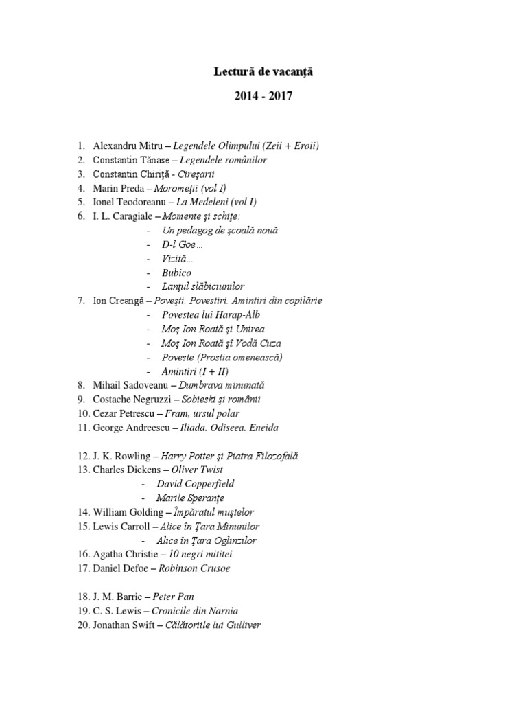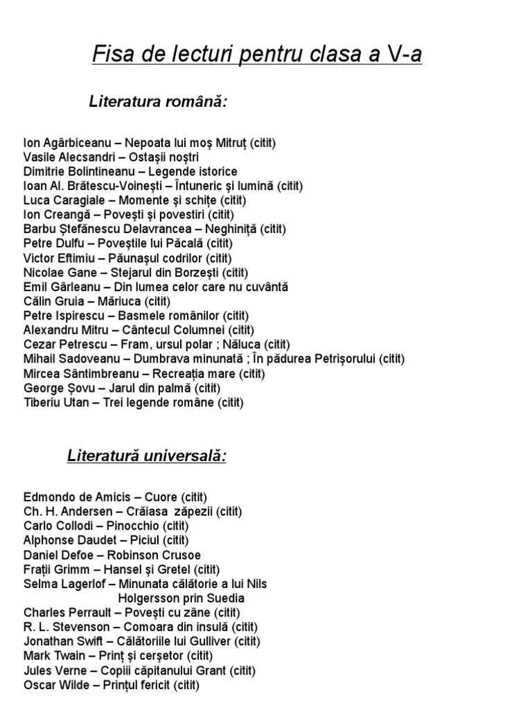 Liste De Lecturi La Romana Pt Clasele 5 8