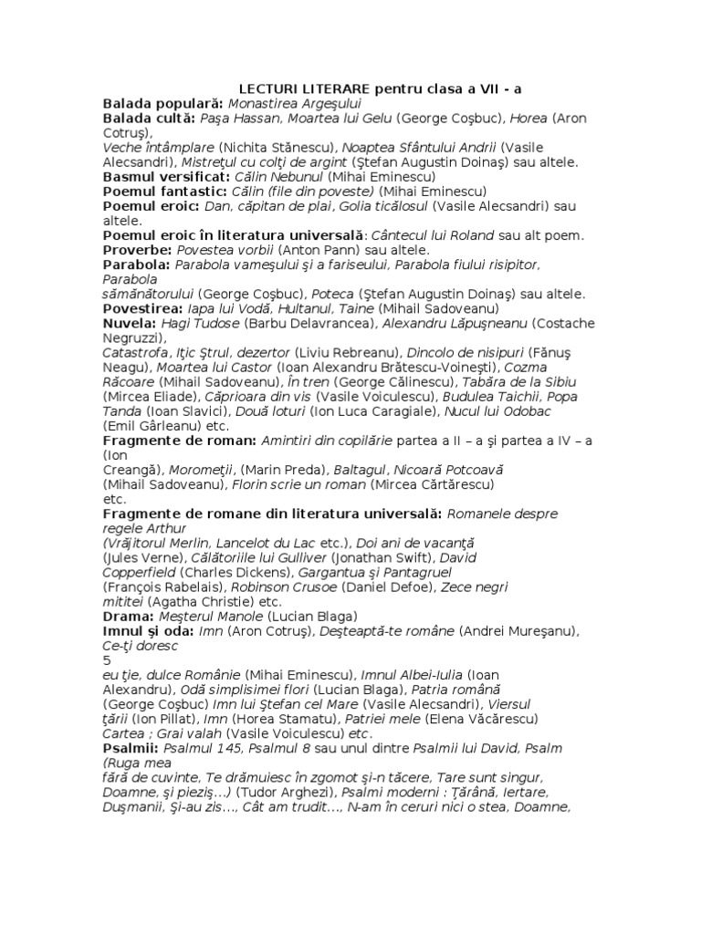 Lecturi Literare Pentru Clasa A Vii