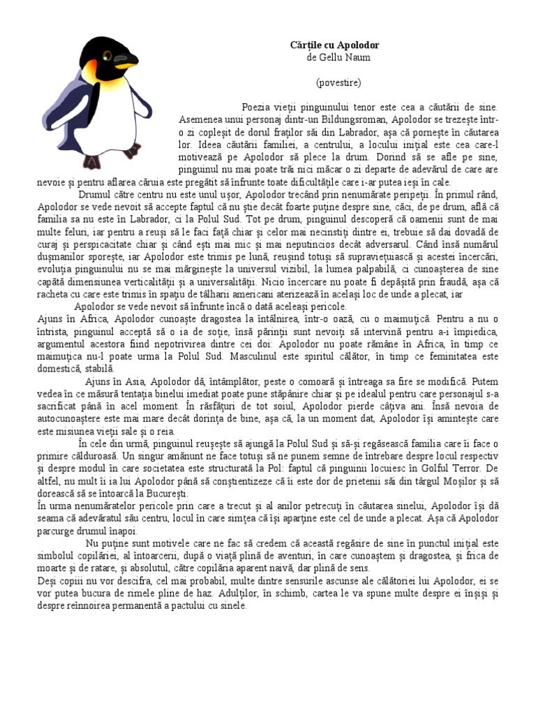 Apolodor Povestea Unui Pinguin Cu Dor De Familie De Gellu Naum Book Style