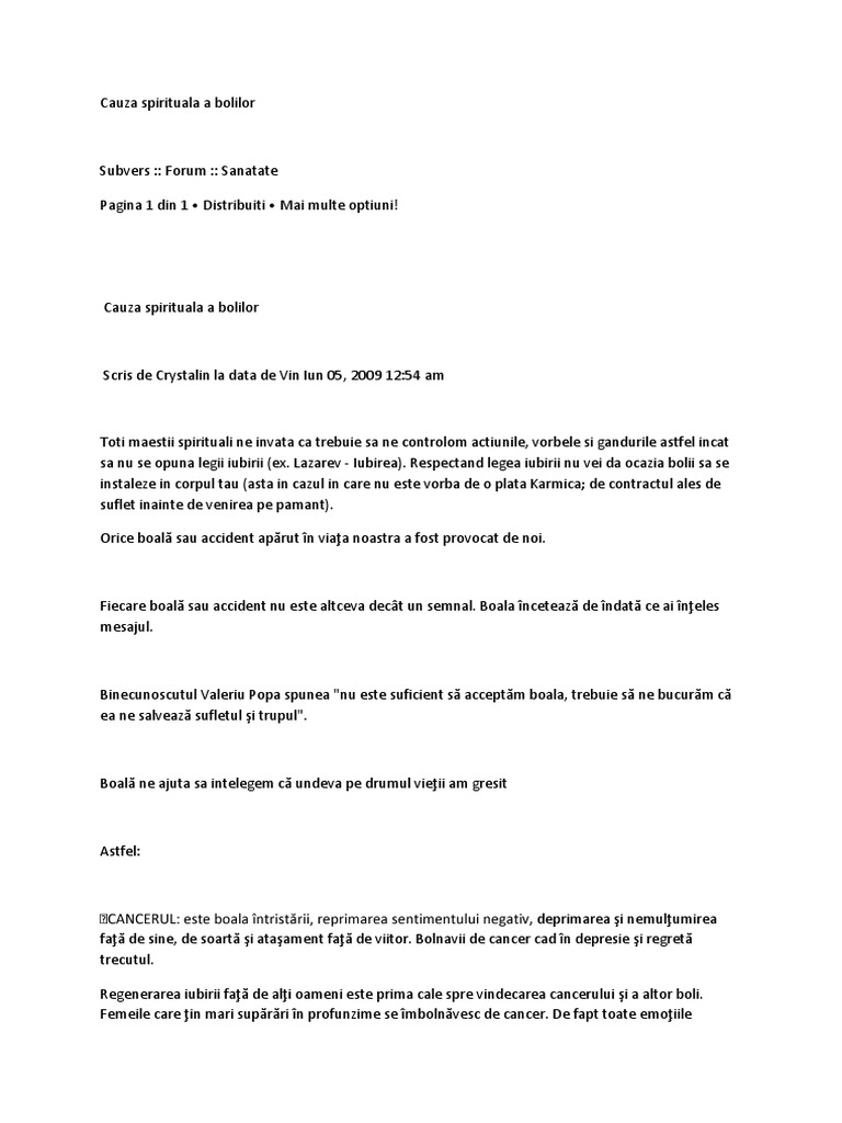 Cauzele spirituale ale bolilor necazurilor și suferințelor noastre enunțate de celebrul valeriu popa de admin 5 iunie 2017 prin boală omul trebuie să înţeleagă că a greşit undeva pe drumul vieţii şi până nu şi elimină greşeala nu se poate vindeca decât parţial deoarece în el persistă cauza generatoare de rău. Cauzele spirituale ale bolilor valeriu popa.