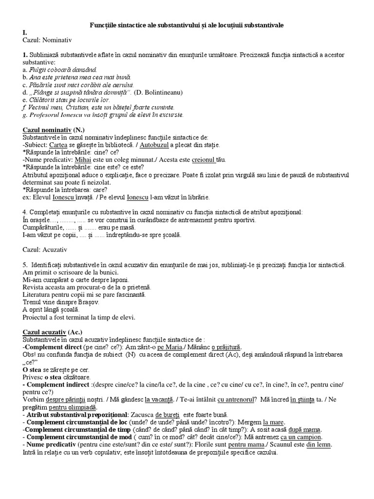 Cazurile Substantivului Si Functiile Sintactice Exercitii