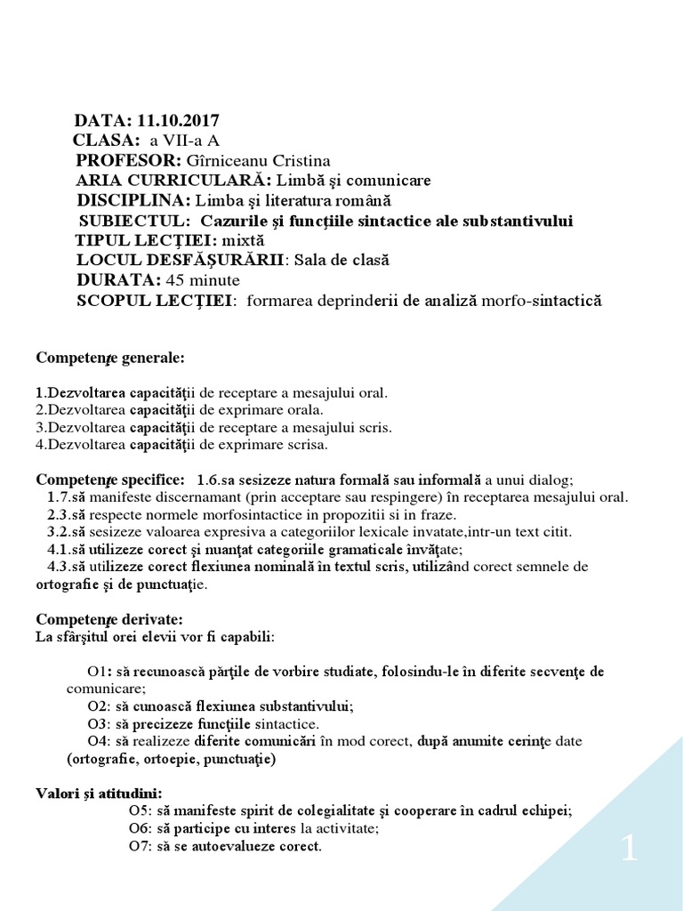 Proiect Did Cazurile Si Functiile Substantivului 7 Pdf