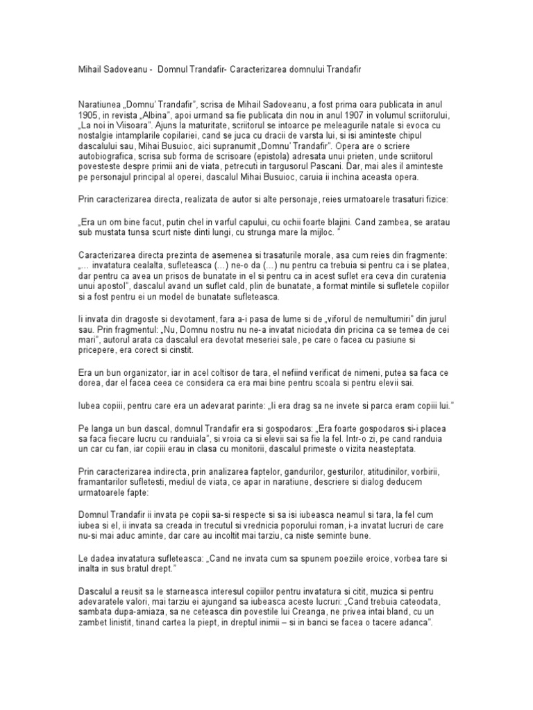 Mihail Sadoveanu Domnul Trandafir Caracterizarea Domnului Trandafir