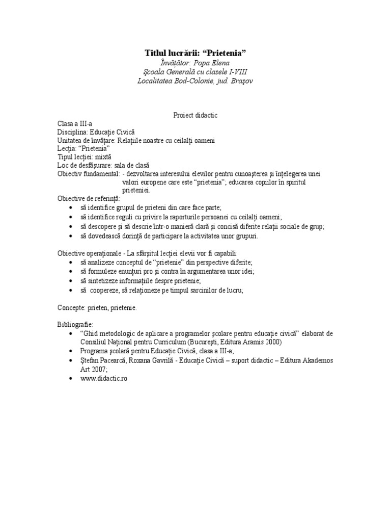 Proiect Didactic Clasa A Iii A Educatie Civica Prietenia
