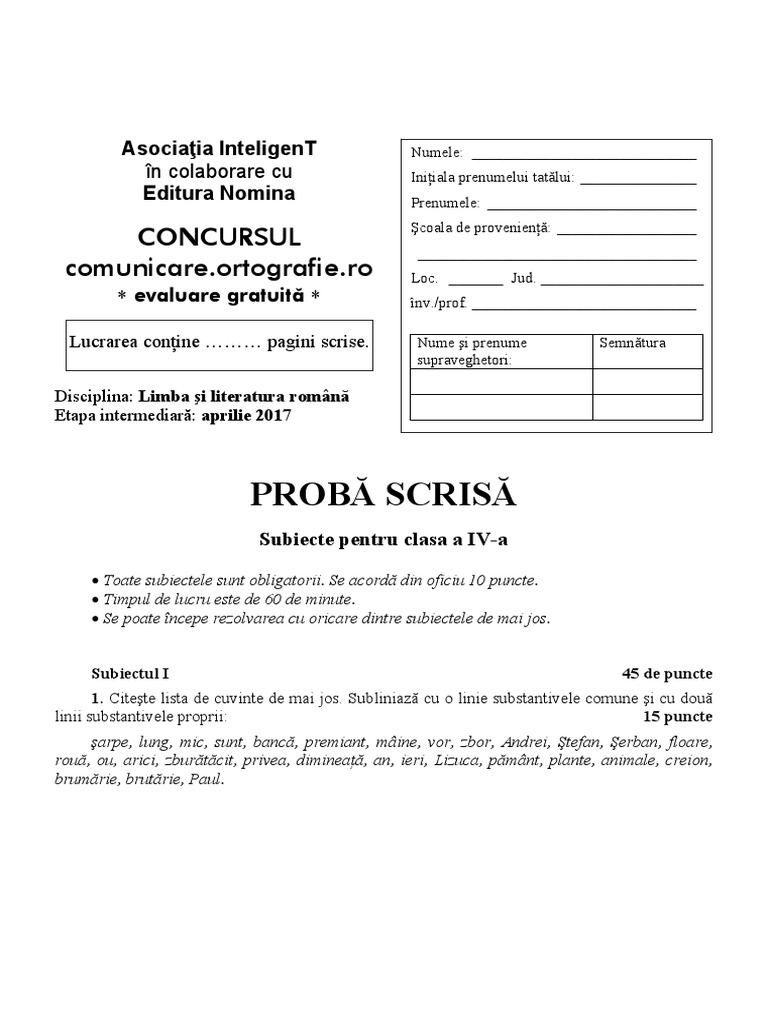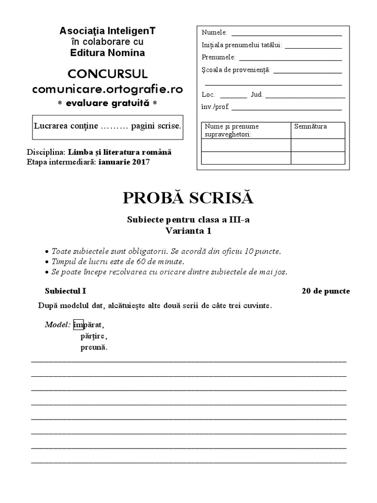 Modele Subiecte Concurs Comunicare Ortografie Clasa A Iii A Var 1