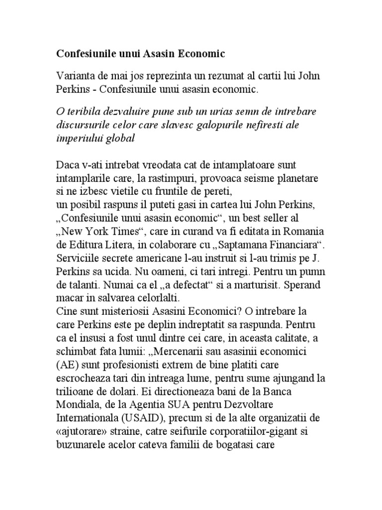 Confesiunile Unui Asasin Economic Varianta De Mai Jos Reprezinta Un Rezumat Al Cartii Lui John Perkins