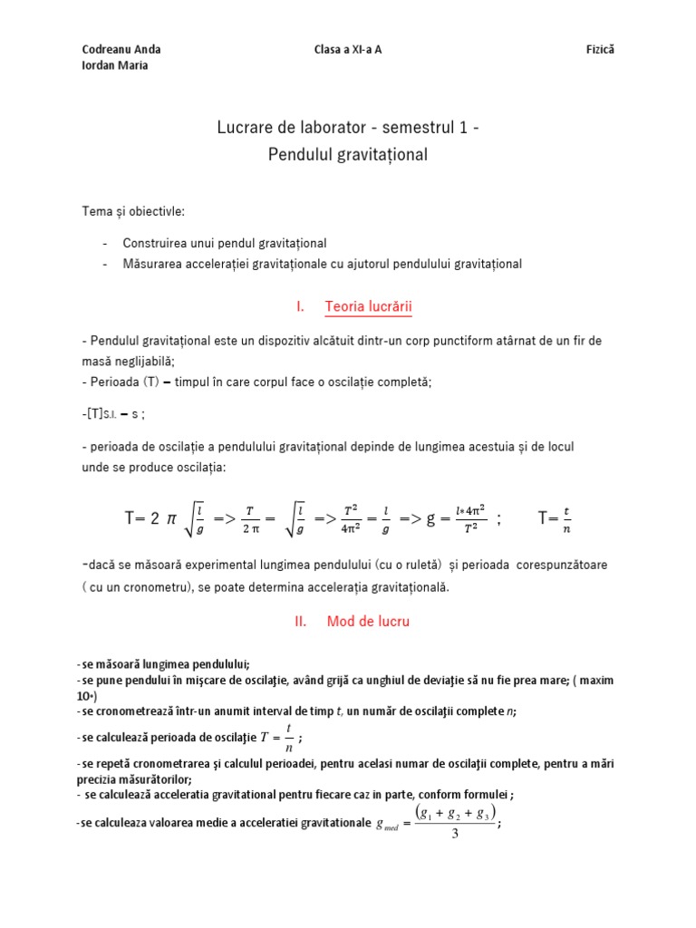 Laborator Studiul Pendulului Gravitational Fizica 6578