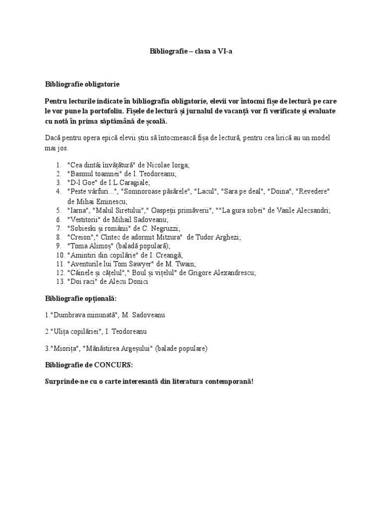 Bibliografie Clasa A Vi A