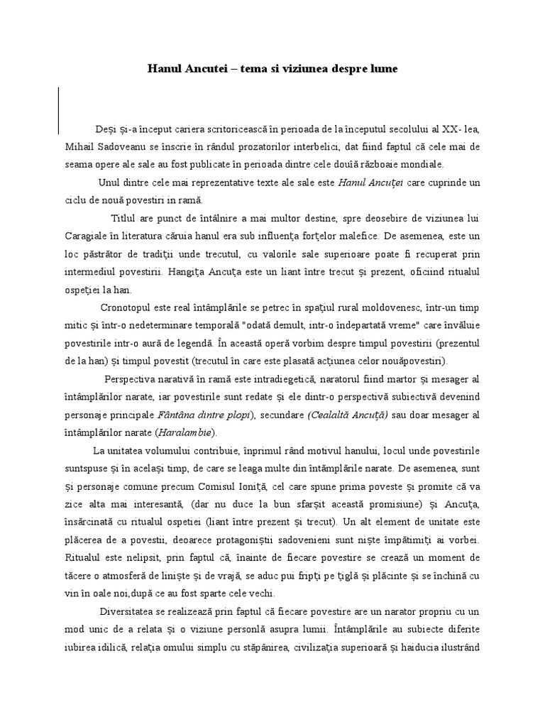 Hanul Ancutei Tema Si Viziunea Despre Lume