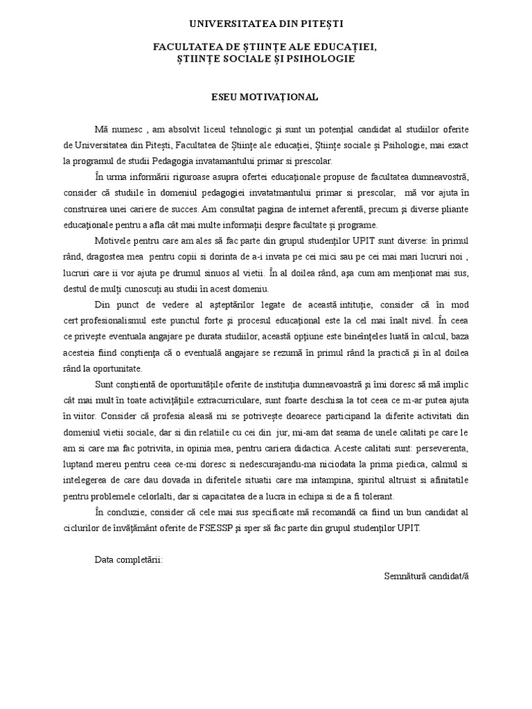 Eseu Motivational Pedagogia Invatamantului Primar Si Prescolar